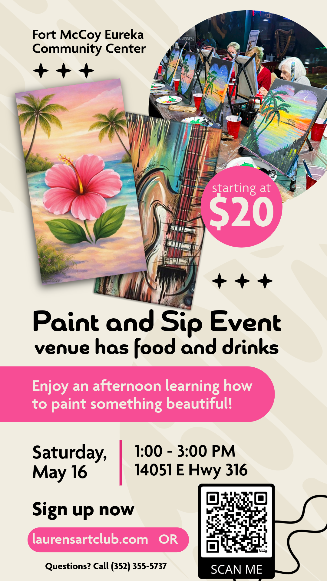 Join us for a relaxing and creative afternoon at the Fort McCoy Eureka Community Center! On Saturday, May 16 from 1:00–3:00 PM, enjoy a fun, step-by-step painting experience perfect for all skill levels.